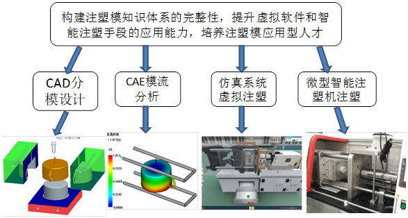 通过微型智能注塑机的演示操作,让学生初步直观认知注塑成型的原理和过程。再运用Moldflow软件的智能模流分析功能,模拟注塑结果,建立工艺经验后,运用注塑机操作仿真系统进行虚拟注塑,熟悉注塑机的操作流程及各工艺参数对制件成型质量的影响。最后在配备取件机械手的微型智能注塑机上进行实际操作,完成注塑生产的真实验证。