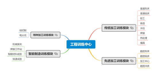 为了培养学生成为具有工程素质、工程能力和创新意识的应用型人才,中心构建了传统加工训练模块、先进加工训练模块、特种加工训练模块、智能制造训练模块四个实训教学模块。
