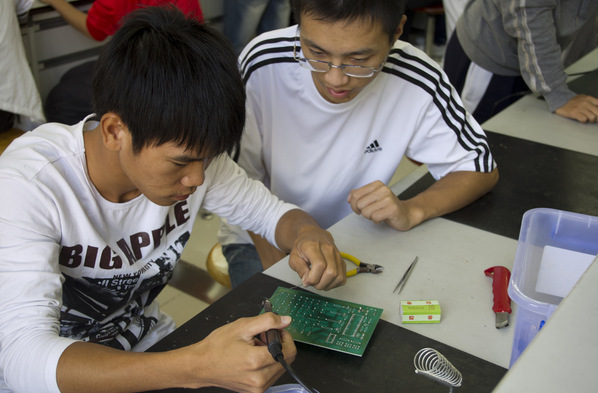 本实验室位于B2-401,占地面积约172m2,是供学生焊接练习、电子产品组装调试操作的实验室,能同时容纳80名学生进行实验操作。配备的仪器设备主要有直流稳压电源、示波器、万用表、交流毫伏表、实习工具箱等。为了改善实习室的空气环境卫生,还专门配备了抽风系统。主要承担《电子工艺实习A》课程实践,可完成焊接练习、元器件检测、电路板焊接、调试、测量等等环节,使学生掌握手工电烙铁焊接技术与拆焊技术、元器件检测与识别、电路各种电路的设计方法,能按电路图接线和查线,进行实验数据的测量及整理,重点培养学生的动手能力,为学习后续课程及从事科学研究工作打下一定的基础。