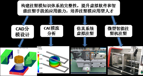 通过微型智能注塑机的演示操作,让学生初步直观认知注塑成型的原理和过程。再运用Moldflow软件的智能模流分析功能,根据零件的几何形状、材料、浇注位置进行模具结构设计,模拟注塑结果,通过逼真地动态模拟分析直观了解塑料注入模腔时的流动情况,验证和优化模具结构设计方案,完成工艺分析报告作业。建立工艺经验后,运用注塑机操作仿真系统进行虚拟注塑,熟悉注塑机的操作流程及各工艺参数对制件成型质量的影响。最后在配备取件机械手的微型智能注塑机上进行实际操作,完成注塑生产的真实验证。