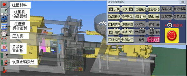 具备注塑机操作过程仿真、参数调节、产品分析等功能,通过逼真的虚拟注塑机实现实训操作与仿真操作同步,能让学生在最短的时间内掌握注塑机操作及提高对注塑机工艺设置的技能。
