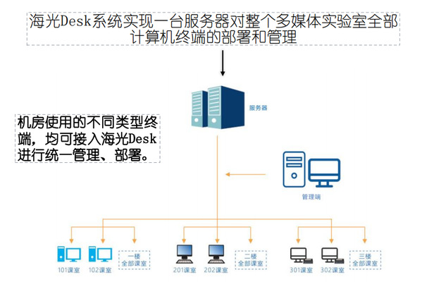 实验室采用海光云Desk系统,配套安装了多媒体网络电子教室和机房管理软件,实现一台服务器实现对整个多媒体实验室全部计算机终端的部署和管理,实现一台教师机对100台学生机的一键开关机、一键系统更新和软件安装更新、一键投屏、上网控制、电子白板、收发作业、远程控制等功能。