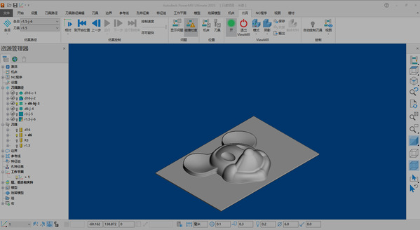 数控编程是数控技术中的重要组成部分,它涉及将零件图纸转化为数控机床可以执行的指令和程序。手工编程适用于简单零件,而自动(计算机软件)编程则适用于复杂零件的加工。自动编程软件是一种利用计算机专用软件来编制数控加工程序的工具,它能够自动进行数值计算和后置处理,生成加工程序单,从而简化编程过程,特别是对于那些计算繁琐、手工编程困难或无法编出的程序,自动编程能够顺利完成。常用的数控编程软件有很多,比如:PowerMill、UG、MasterCAM、CAXA等等,这些软件各具特色。下图4为PowerMill软件编程模拟仿真的效果图: